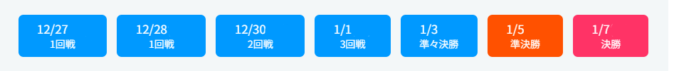 全国高校ラグビー大会(通称:花園大会)は毎年年末~年始にかけて、東大阪市の近鉄花園ラグビー場にて開催されます。通例ですと、12月27日に開会式及び1回戦、28日に1回戦の残り試合、1日あいて30日から2回戦(この日からシード校も試合)となります。記念大会等で日程が変更になる場合もありますので、事前に公式サイト等で日程を調べてから予定を立ててください。