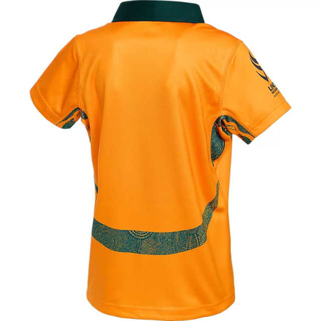 脇から背中にかけて、先住民アボリジニの伝統的なアート柄が美しく施されています。さらに、ワラビーズとライオンズの両チームロゴが向かい合った限定デザインがサイドに刻まれており、歴史的な対戦を象徴しています。