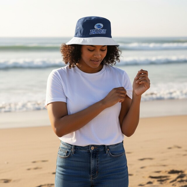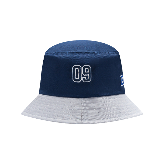 通気性の良いツートーンデザインの公式 ブルース 2026 バケットハット。コントラストの効いたつば(ブリム)と刺繍されたチームロゴが特徴。