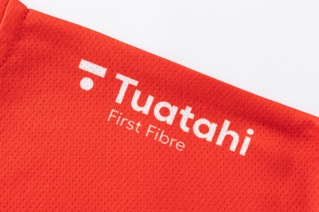 ・目立つスポンサーアクセントと胸元ストライプ