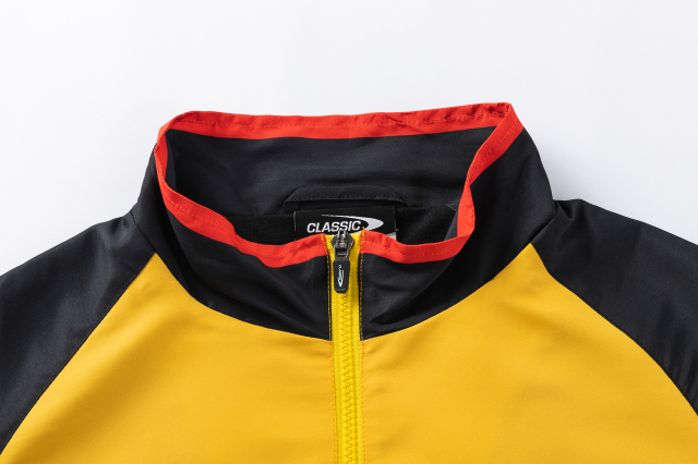 ラグビーウェアの力強さと、洗練されたカラーブロックが見事に調和。ブラックを基調に、イエローとレッドのラインが絶妙なアクセントとなるこの一着は、デニムやカーゴパンツと合わせるだけで、エネルギッシュな都会派スタイルを演出します。