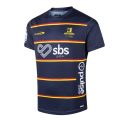 公式 2026 ハイランダーズ プロ トレーニング TEEは、目を引くスポンサーアクセントと印象的な胸のストライピングが特徴で、大胆な印象を与える。
