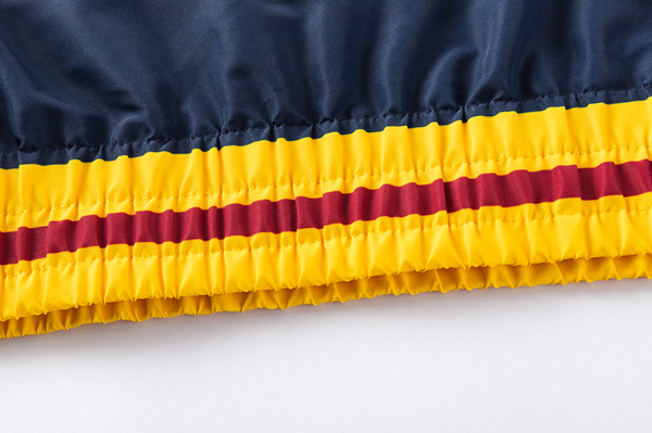 2026年、ファッション界でも注目されるハイランダーズのカラーパレット。鮮やかなイエローと深みのあるマルーン、ネイビーのコントラストが美しいこのウィンドブレーカーは、都会的なレイヤードスタイルの主役を飾ります。