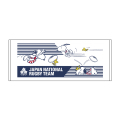 タオルの全体に、ラグビー日本代表のユニフォームを着たスヌーピーたちが、ラグビーボールを追いかけている様子が描かれています。ストライプ柄を背景に、躍動感あふれるイラストがとても可愛らしいデザインです。